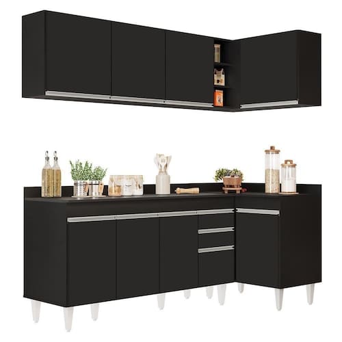 Além de ser composto por peças essenciais, como balcão para pia 150cm, balcão de canto e armários aéreos, esse jogo de cozinha ainda conta com uma maior resistência contra riscos e umidade, garantindo sua durabilidade por muito tempo, graças ao acabamento em BP. Já os pés ajustáveis permitem você nivelar o móvel em qualquer tipo de piso. Para completar, o design contemporâneo dessa cozinha de canto se adapta facilmente a qualquer estilo de decoração, ao passo que essa configuração otimiza a circulação no ambiente. Bom demais, não é mesmo?!