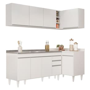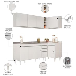 Conteúdo da Embalagem: 1 Balcão 150cm, 1 Armário Aéreo 150cm, 1 Balcão de canto, 1 Armário Aéreo de Canto, 1 Pia Inox 150cm.