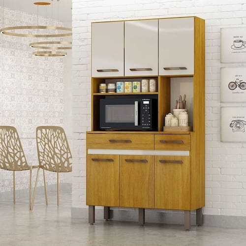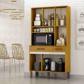 Conta com dois compartimentos abertos para pequenos eletrodomesticos, como liquidificador e cafeteira, alem de nicho para micro ondas.