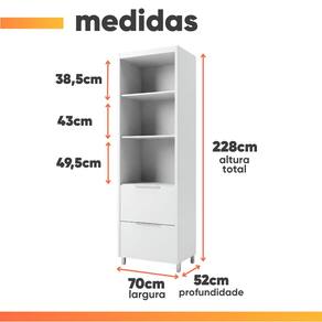 MEDIDAS: A = 218 / 228 cm (com pés) L = 70 cm P = 52 cm ALTURA PÉS: A = 10 cm PRATELEIRAS SUPORTAM ATÉ: 15 kg GAVETAS SUPORTAM ATÉ: 10 kg PESO SUPORTADO: 65 kg PESO: 76,5 kg MODELO: Armário de Cozinha Paneleiro 2 Portas 2 Gavetas 100% MDF Mariah MARCA: Nesher MATERIAL: MDF PINTURA: UV de alta qualidade ACABAMENTO: Fosco ESPESSURA DO MATERIAL: 15 mm PORTAS: 2 TIPO DE PORTA: Bater, abertura de toque (One Touch) PRATELEIRAS: 3 GAVETAS: 2 CORREDIÇA: Telescópicas (3 estágios) PUXADORES: 2 (Alça) MATERIAL DOS PUXADORES: Metal PÉS: 4 (reguláveis) MATERIAL DOS PÉS: Plástico SISTEMA DE MONTAGEM: Parafusos, minifix e cavilhas DIFERENCIAIS: Amplo espaço para melhor armazenamento / Estrutura 100% MDF / Portas com sistema de abertura com toque (One touch) / Gaveta com corrediças telescópicas com 3 estágios / Pés reguláveis. ITENS INCLUSOS: 1 armário paneleiro, 1 manual de montagem, 1 kit parafusos INSTRUÇÕES E CUIDADOS: Para maior durabilidade, recomendável que a limpeza dos móveis seja feita com pano limpo e seco. Não usar produtos químicos ou abrasivos. GARANTIA: 3 meses pelo fabricante.