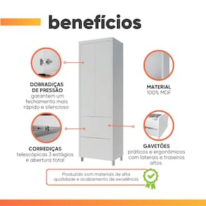 O armário paneleiro Mariah foi desenvolvido para trazer praticidade e elegância à sua cozinha. Com amplo espaço interno, ele permite organizar utensílios, panelas e mantimentos de forma eficiente, mantendo tudo sempre ao seu alcance. Sua estrutura 100% MDF garante resistência, durabilidade e um acabamento superior. As 2 portas com sistema de abertura One Touch oferecem um toque de modernidade e conforto ao uso diário. Com apenas um leve toque na porta, libera a abertura automaticamente sem necessidade de puxadores, proporcionando um visual mais limpo e sofisticado, além de ser prático. As 2 gavetas com corrediças telescópicas de 3 estágios garantem abertura suave e total, permitindo visualizar e acessar todo o conteúdo com facilidade. Para completar, os pés reguláveis facilitam o nivelamento e asseguram estabilidade em qualquer tipo de piso. Transforme sua cozinha com funcionalidade, beleza e tecnologia. Aproveite para conhecer também os outros módulos da linha e monte o conjunto perfeito para o seu espaço!