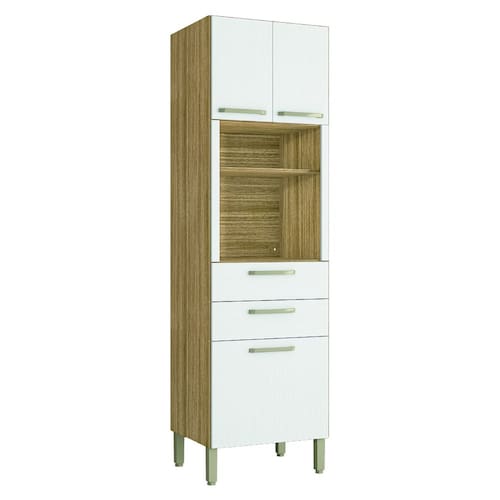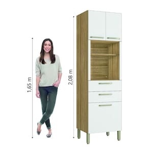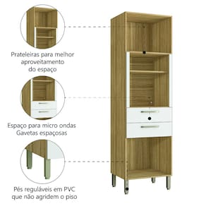 MEDIDAS: [ A ] = 208 cm [ L ] = 60 cm [ P ] = 51,8 cm ALTURA DOS PÉS: 17 cm PESO: 47,4 kg PESO SUPORTADO: 15 kg PESO SUPORTADO POR PRATELEIRA: 5 kg PESO SUPORTADO POR GAVETA: 10 kg MODELO: Armário de Cozinha Paneleiro Com Nicho Para Micro Ondas 3 Portas 2 Gavetas Ametista MARCA: Kit’s Paraná COR: Madeirado / Freijó / Branco ACABAMENTO: Fosco MATERIAL DA ESTRUTURA: MDP ESPESSURA DO MATERIAL DA ESTRUTURA: 15mm PORTAS: 3 TIPO DE PORTA: Bater DOBRADIÇAS: Metálicas GAVETAS: 2 CORRDIÇAS: Telescópicas PRATELEIRAS: 1 POSSUI NICHOS: Sim POSSUI TAMPO: Sim MATERIAL DO TAMPO: MDP PUXADORES: 5 MATERIAL DOS PUXADORES: Plástico PÉS: 4 MATERIAL DOS PÉS: Plástico GARANTIA: 3 meses ITENS INCLUSOS: 1 Paneleiro, 1 Manual de montagem, 1 Kit Parafusos INSTRUÇÕES E CUIDADOS: Para maior durabilidade, recomendável que a limpeza dos móveis seja feita com pano limpo e levemente umedecido em água e sabão neutro. Em seguida, deverá ser passado um pano limpo e seco.
