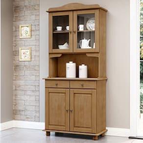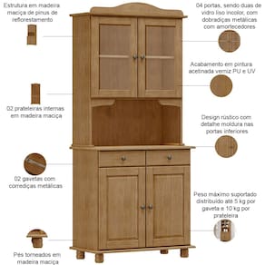 Fabricado em madeira maciça de alta resistência, esse armário de 4 portas (sendo 2 com vidro estilo cristaleira) e 2 gavetas práticas oferece o equilíbrio ideal entre armazenamento e exibição decorativa. Os pés torneados e os puxadores em tonalidade envelhecida mantêm o charme vintage característico, enquanto as portas de vidro permitem mostrar suas peças favoritas - como conjuntos de xícaras ou geleias artesanais. Embora seja uma versão de armário de cozinha compacto, não economiza nas qualidades; afinal, conta com estrutura robusta, cristaleira integrada e armazenamento inteligente. Demais, não é mesmo?!