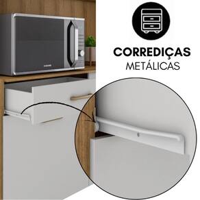 O balcão possui um tampo resistente, ideal para suportar as atividades do dia a dia, facilitando a preparação de refeições. As alças resistentes garantem durabilidade, enquanto o sistema de corrediças de metal permite um fechamento suave e eficiente.