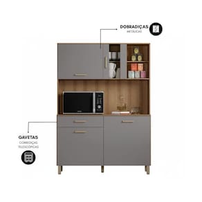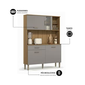 Este armário inclui prateleiras bem distribuídas que maximizam o espaço vertical, permitindo a organização eficiente de louças, copos e mantimentos. A superfície inferior oferece um tampo prático para apoio ou para acomodar seus utensílios domésticos.