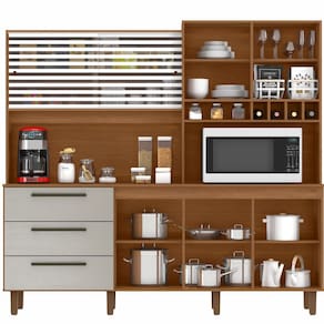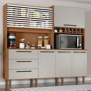 Estrutura: MDP, com espessura de 15 mmAcabamento: Em pintura U.V, resistentePorta: Sim, 05 portas, sendo 01 porta superior basculante com pistão a gás, 02 portas com vidros temperados com serigrafia personalizada e com dobradiças metálicasGaveta: Sim, 03 gavetas com corrediças metálicas e travamento no fundo e sendo 01 gaveta com divisões para talheresPrateleira: Sim, 7 prateleirasNicho: Sim, adega para 4 garrafas e um nicho para temperosPuxadores: Sim, em PVCPés: Sim, sendo 8 pés em PVC com regulagem de alturaDiferencial: Espaço para micro-ondas e design eleganteDimensões do produto montado