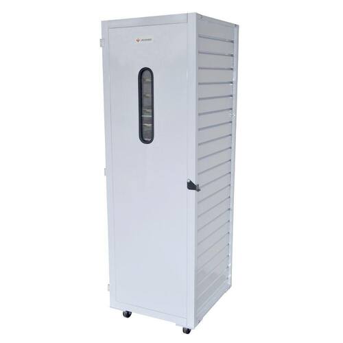 O Armário Crescepão AC20E modelo fechado é fabricado totalmente em chapa de aço carbono, SAE 1020. Seu acabamento é feito em pintura a pó eletrostática com base fosfatizada contando com visor de vidro na porta, rodízios resistentes para facilitar o deslocamento e sendo totalmente desmontável!