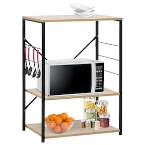 Armário de micro-ondas vidaXL em preto e carvalho — Construção multiuso, projetada em madeira e aço com ganchos para acessórios, solução de armazenamento de três camadas para cozinha, sala de estar ou escritório