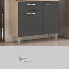 Ampla bancada para auxiliar no preparo de alimentos ou mais espaco de armazenamento. Portas com dobradicas metalicas e gavetas com corredicas metalicas, para mais estabilidade ao abrir e fechar