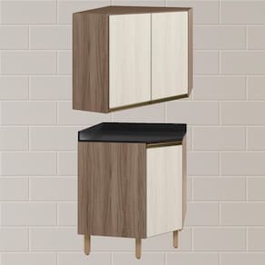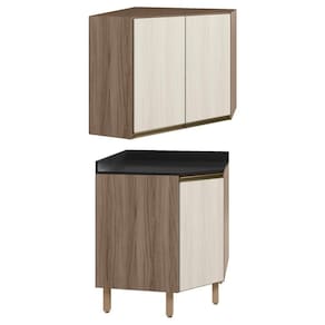Conjunto de Armário Aéreo e Balcão Canto Oblíquo para cozinha, funcional e moderno, ideal para composições que otimizam o espaço com elegância. Fabricado 100% em MDF, com estrutura e tampo de 15mm e forro de fundo de 3mm, o conjunto é composto por 1 armário aéreo com 2 portas com dobradiças de 35mm com amortecedores, que garantem um fechamento suave e silencioso, além de 1 prateleira interna e puxadores em perfil de alumínio, e 1 balcão com tampo que conta com 1 porta, 1 prateleira interna, puxadores em perfil de alumínio, dobradiças com amortecedores e 5 pés com altura de 15,5cm e regulagem adicional de 1,5cm, assegurando estabilidade em diferentes tipos de piso. Estes móveis chegarão em sua casa separados em 05 volumes.