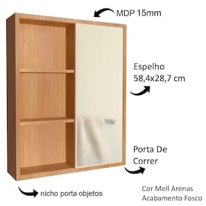 Características adicionais: Porta de correr com espelho, 6 nichos porta objetos, tamanho do espelho 58,4x28,7 cm
