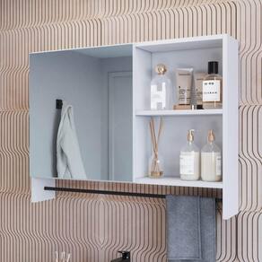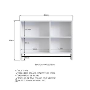 A espelheira ES8020 é produzida em MDP 15mm e acabamento em FF fosco. A estrutura do fundo é em MDF 3mm. Possui 1 porta de bater com espelho 3mm e dobradiça metálica ; prateleiras internas, 1 toalheiro metálico e 2 nichos. Necessita fixação na parede. Produto suporta até 10kgs. Conteúdo da embalagem: móvel, ferragens e manual de montagem. A fixação das peças e/ou acessórios é feita por parafusos e cavilhas. Para a limpeza do móvel utilizar pano levemente umedecido. Garantia de 03 meses contra defeitos de fabricação. Medidas do produto (AxLxP): 60x80x16cm. Peso do produto: 10,7kgs. Marca: Prodecor