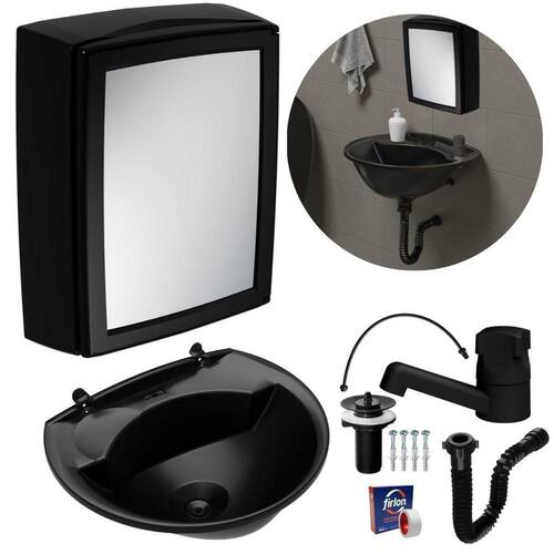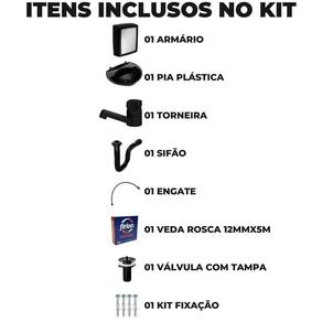 Armário espelheira + pia lavatório 4l + torneira preta + sifão universal sanfonado + engate flexível + fita veda rosca Armário banheiro espelhiera sobrepor 30x11x37cm 01 porta astra Com um design moderno e traços retos, o armário otimiza o espaço do ambiente, organizando e armazenando com eficiência os objetos do dia a dia. Ele já vem montado, o que facilita a instalação, e pode ser instalado sobreposto à parede, proporcionando ainda mais praticidade. Esse armário também possui uma ampla superfície de espelho, que aumenta a funcionalidade do produto, permitindo que os usuários se arrumem com mais comodidade e praticidade. Além disso, sua divisão interna com porta-escovas e prateleiras embutidas oferece espaço suficiente para armazenar itens de higiene pessoal, remédios, maquiagens e outros produtos do dia a dia. Especificações técnicas Modo de instalação: sobrepor Material: poliestireno Acabamento: brilhante Abertura da porta: ambos os lados Quantidade de portas: 1 porta s Acompanha espelho: sim Espelho interno: não Quantidade de prateleiras: 2 prateleiras Tipo de material: plástico Cor: preto Garantia do fabricante: 90 dias Manual: sim Dimensões: 30 x 10,8 x 36,9cm Pia lavatorio banheiro plástico 4l preto astra A pia plástica para banheiro da marca astra é uma opção prática e funcional para instalação em ambientes com espaços reduzidos. Com dimensões compactas e design simples, é fabricada em polipropileno de alta qualidade, o que garante sua resistência e durabilidade. Com capacidade de armazenamento de 4 litros, essa pia é indicada para uso em banheiros e lavabos, sendo uma solução ideal para quem busca uma alternativa econômica e de fácil instalação. Além disso, sua superfície lisa facilita a limpeza e manutenção, permitindo que ela se mantenha higiênica e livre de germes e bactérias. Especificações técnicas Material: polipropileno Dimensões: 35,5 x 28 x 15,8cm Possui porta sabonete: sim Possui furo para torneira: não Capacidade: 4,0l Locais sugeridos: banheiros e lavabos Acabamento: brilhante Marca: astra Cor: preto Formato: oval Garantia do fabricante: 90 dias Torneira para lavatório plástica preta japi A torneira para lavatório possui o volante anatômico, que facilita a abertura e o fechamento, o plástico abs com proteção uv, e a durabilidade e a qualidade sempre presente nos produtos da japi. Especificações técnicas Composição: plástico de engenharia abs , polipropileno pp e elastômeros Utilização: água fria Fabricação: nacional Sifão sanfonado universal 61cm preto astra O sifão sanfonado universal astra é um acessório essencial de encanamento, projetado para se adaptar a qualquer saída de válvula de pia e a qualquer tubulação de esgoto, independentemente de seu tamanho ou tipo. Além disso, o sifão sanfonado universal astra corrige possíveis desalinhamentos entre a cuba e a tubulação de despejo, evitando assim a formação de bloqueios e obstruções que possam causar vazamentos ou refluxo de água suja. Especificações técnicas Material: polipropileno Entrada para válvula polegada : 7/8 Saída para tubos e conexões: 38, 40, 48 e 50mm Modelo: para pias, cubas, tanques, lavatórios e válvula americana Suporta temperatura até: 90 graus Cor: preto Acabamento: brilhante Garantia do fabricante: 90 dias O kit segue com todos os itens para montagem e pronto para uso após a instalação Garantia A garantia se aplica a todo e qualquer vício ou defeito aparente ou que não estejam em conformidade com o produto. - 90 dias para o armário - 90 dias para a pia plástica - 30 dias para a torneira - 90 dias para o sifão - 90 dias para o engate Itens inclusos 01 armário 04 buchas s6 04 parafusos 3 x 30mm 01 pia plástica 01 torneira 01 sifão 01 engate 01 rolo de fita veda rosca 12mm x 5m 01 suporte 01 válvula com tampa 04 buchas s8 02 parafusos 3,5 x 30mm 06 arruelas