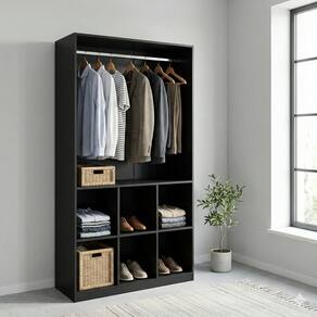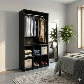Versátil – Ideal para closets ou lojas Com cabideiro – 87 cm de espaço para pendurar 6 nichos amplos – Para roupas, bolsas ou sapatos Material – MDF 15 mm de alta qualidade Tamanho – 1,85m alt. x 90cm larg. x 35cm prof.