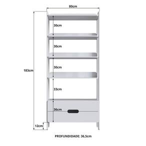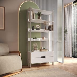 Seu amplo espaço interno é distribuído de forma inteligente: 4 prateleiras espaçosas proporcionam praticidade para acomodar livros, objetos decorativos, utensílios ou o que mais você precisar. Além disso, o móvel conta com 2 gavetas generosas, ideais para armazenar itens menores, garantindo tudo sempre à mão e em perfeita ordem.