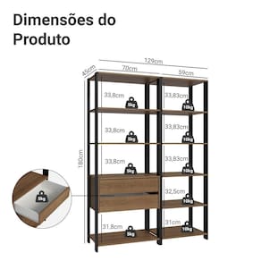 Nome do Simples no Fornecedor: Armário Estante Multiuso Organizador 2 Gavetas 9 Prateleiras 129cm Rustic/Preto Madesa