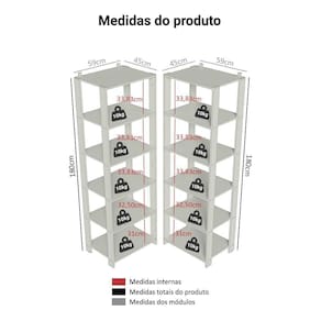 Nesta versão de canto, é perfeita para aproveitar o máximo do espaço do seu ambiente. São dez prateleiras amplas que permitem armazenar louças, potes, eletros e muito mais. Assim, você conta com um espaço funcional e otimizado.