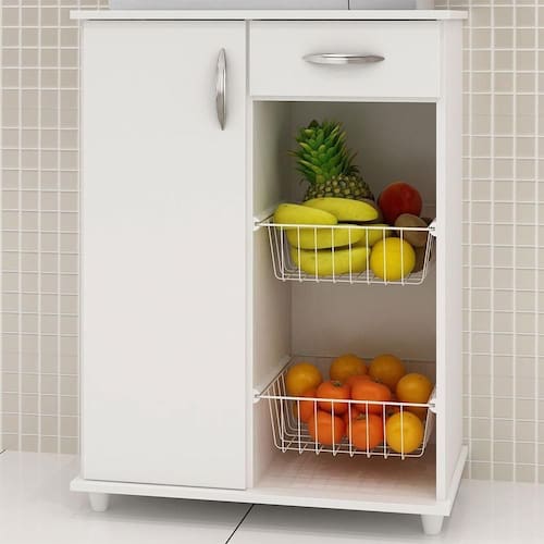 A Fruteira Belize Notável é um móvel multiuso que vai deixar sua cozinha mais prática e funcional. Com superfície para colocar bebedouro, forno ou micro-ondas, essa fruteira de madeira é composta por 01 porta com dobradiça metálica, capaz de garantir mais suavidade ao movimento de abrir e fechar a porta. Tem uma prateleira interna que é bem dividida e permite organizar os utensílios como desejar. A fruteira balcão possui 01 gaveta com corrediça metálica, que traz maior leveza ao movimento, sem contar que nessa gaveta você ainda pode guardar objetos menores, que precisam estar sempre à mão quando necessário. A fruteira multiuso tem os puxadores em PVC cromado, que além de alta qualidade é um modelo clássico que nunca sai de moda. Tem também 02 cestos aramados que são ótimos para armazenar frutas e legumes de forma mais fácil. Essa fruteira para cozinha Belize Notável possui sua estrutura em madeira MDP que é extremamente resistente a umidade, evitando o empenamento. Já a pintura U.V. com acabamento em brilho, além de proteger o móvel quanto a exposição da luz, oferece maior durabilidade da cor. O balcão de cozinha para fruteira vem com os pés redondos e reforçados, com capacidade para suportar até 33 kg e ainda possibilitam facilidade na movimentação e limpeza do seu ambiente. Tudo isso faz desse armário para micro-ondas com fruteira o produto ideal para manter sua cozinha mais organizada e com um design moderno. Cor: Branco Cor: Branco