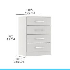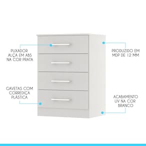 Você merece o melhor quando se trata de móveis para sua casa e a escolha certa para atender todas as suas necessidades. Com um design atual, une versatilidade, conforto e beleza. Com quatro gavetas, você terá muito espaço para manter tudo organizado e ao alcance das mãos. Produzida com materiais de excelente qualidade, garantindo a sua resistência ao desgaste diário e mantendo sua beleza e funcionalidade por muito tempo. O melhor em móveis no design atual aliando conforto, qualidade e ótimos preços, só na Menu Móveis! CARACTERÍSTICAS TÉCNICAS: - Produzido em MDP de 12 mm - Acabamento UV na cor Branco - Gavetas com Corrediça Plástica - Puxadores Alça em ABS na cor Cromado INFORMAÇÕES TÉCNICAS: Altura: 93 cm Largura: 55,5 cm Profundidade: 38,5 cm Peso: 20 kg INFORMAÇÕES ADICIONAIS: *ATENÇÃO: Não trabalhamos e não nos responsabilizamos pela montagem do móvel. Antes da montagem conferir se o produto está de acordo com o que comprou, produto montado e danificado pela montagem não será aceito troca. **As imagens ambientadas são meramente ilustrativas e podem apresentar itens que não compõe o produto. As cores do produto podem variar de acordo com o monitor, a iluminação do ambiente ou sua percepção visual. ***Limpeza: Deve ser feita com pano macio e seco ou levemente umedecido com água e sabão neutro. Não devem ser utilizados abrasivos como palha de aço e objetos cortantes. Garantia para defeitos de fabricação conforme Código de Defesa do Consumidor. Ean: 6015057226239 Ean: 6015057226239