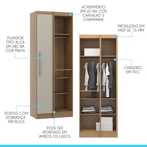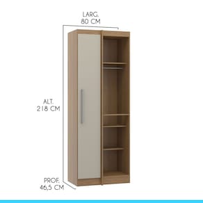 O Armário de Canto para Guarda Roupa Modulado Selene foi desenvolvido para atender todas as suas necessidades do dia a dia com um design moderno, unindo funcionalidade e versatilidade. Os móveis modulados são a tendência do momento, assemelham aos moveis planejados, facilitam a composição do espaço e possibilitam infinitas modulações diferentes para deixar o seu ambiente muito mais aconchegante. Além disso, o armário de canto pode ser montado em ambos os lados, se adaptando a modulação planejada. O Armário Selene é produzido com materiais de excelente qualidade, garantindo a durabilidade e vida útil. Conheça a nossa linha de Quarto Modulado Selene, você vai se surpreender. O melhor em móveis no design atual aliando conforto, qualidade e ótimos preços, só na Menu Móveis! CARACTERÍSTICAS TÉCNICAS: - Produzido em MDP de 15 mm - Acabamento UV na cor Carvalho e Champanhe - Puxador tipo Alça em ABS na cor Prata - Porta com Dobradiça Metálica - Cabideiro em PVC - Maleiro *Pode ser montado em ambos os lados, se adaptando a modulação que você planejar. INFORMAÇÕES TÉCNICAS: Altura: 218 cm Largura: 80 cm Profundidade: 46,5 cm Peso: 50 kg INFORMAÇÕES ADICIONAIS: - ATENÇÃO: Não trabalhamos e não nos responsabilizamos pela montagem do móvel. Antes da montagem conferir se o produto está de acordo com o que comprou, produto montado e danificado pela montagem não será aceito troca. Montagem e instalação por conta do comprador. - As imagens ambientadas são meramente ilustrativas e podem apresentar itens que não compõe o produto. As cores do produto podem variar de acordo com o monitor, a iluminação do ambiente ou sua percepção visual. - Limpeza: Deve ser feita com pano macio e seco ou levemente umedecido com água e sabão neutro. Não devem ser utilizados abrasivos como palha de aço e objetos cortantes. Garantia para defeitos de fabricação conforme Código de Defesa do Consumidor. Ean: 7793484710192 Ean: 7793484710192