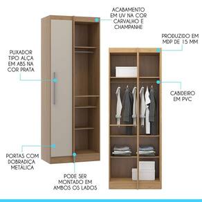 Armário Guarda Roupa De Canto Selene 80x218 Mdp Menu Móveis Carvalho O Armario de Canto para Guarda Roupa Modulado Selene foi desenvolvido para atender todas as suas necessidades do dia a dia com um design moderno, unindo funcionalidade e versatilidade. Os moveis modulados sao a tendencia do momento, assemelham aos moveis planejados, facilitam a composicao do espaco e possibilitam infinitas modulacoes diferentes para deixar o seu ambiente muito mais aconchegante. Alem disso, o armario de canto pode ser montado em ambos os lados, se adaptando a modulacao planejada. O Armario Selene e produzido com materiais de excelente qualidade, garantindo a durabilidade e vida util. Conheca a nossa linha de Quarto Modulado Selene, voce vai se surpreender. O melhor em moveis no design atual aliando conforto, qualidade e otimos precos, so na Menu Moveis! Caracteristicas: Produzido em MDP de 15 mm Acabamento UV na cor Carvalho e Champanhe Puxador tipo Alca em ABS na cor Prata Porta com Dobradica Metalica Cabideiro em PVC Maleiro Pode ser montado em ambos os lados, se adaptando a modulacao que voce planejar.