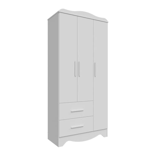 Possui 3 portas lisas, cabideiro metálico para pendurar roupas de forma organizada e 2 gavetas amplas com corrediças telescópicas metálicas para abertura suave e silenciosa. Os puxadores, fabricados em MDF revestido com papel melamínico, proporcionam durabilidade e beleza. O produto acompanha dois modelos de rodapés (reto ou usinado/torneado), permitindo personalizar o visual durante a montagem.