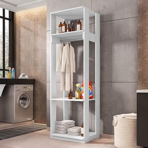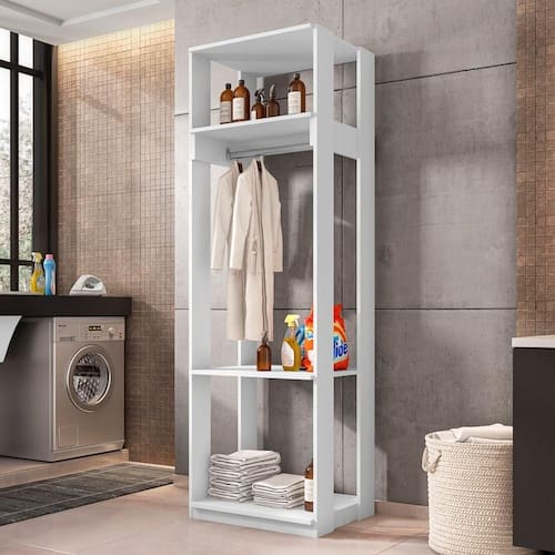 Produto com cabideiro de alumínio e prateleiras. Versátil e se adapta a vários ambientes.