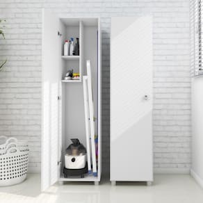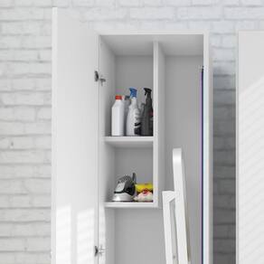 O Armário Lavanderia Multiuso com 1 Porta Multimóveis possui 2 nichos internos com espaço para guardar vassoura, aspirador de pó e/ou baldes. Sua estrutura é em MDP, acabamento em pintura UV, com acompanhamento de gancho, e suporta 5Kg cada prateleira e 20Kg base. Este móvel garante melhor organização dos objetos de forma simples e prática.