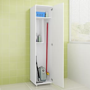 O Armário Lavanderia Multiuso com 1 Porta Multimóveis possui 1 porta e 2 nichos internos, com espaço para guardar vassoura e rodo. Sua estrutura é em MDP, acabamento em pintura UV, com acompanhamento de gancho e rodízio. Suporta 8Kg cada prateleira e 6Kg no nicho interno. Este móvel garante melhor organização dos objetos de forma rápida, simples e prática.