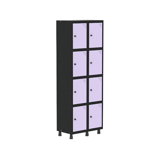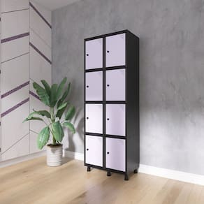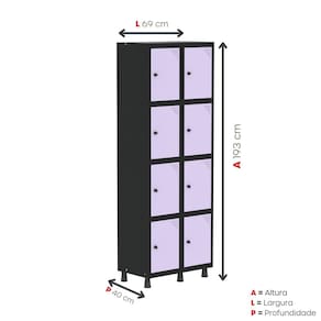Armário Roupeiro de Aço totalmente montável, dispensa a utilização de parafusos, estrutura em chapas #24 e #26 (6cm e 4,5cm) conta com uma porta com estampos circulares em formação triangular para ventilação, sistema de fechamento de varão de 3 pontos, através de pitão para cadeado. Ambiente Principal: Banheiro Complexidade da Montagem: Média: pode ser montado por mais de uma pessoa e/ou necessite de maior conhecimento para montagem Cor: Preto/Lilás Cor da Porta: Preto Cor do Produto: Preto/Lilas Formato do Armário: Retangular Itens Inclusos: 01 Armário + Manual de Montagem. Manual de Montagem e Instalação: https://product-hub-prd.madeiramadeira.com.br/972738/documents/33736253-4618-4a6a-bbf7-d0bd087859b16014roupeiro4portasvirtual.pdf Marca: Pandin Móveis Material Principal: Aço Necessita Montagem: Sim Origem do Produto: Nacional Peso Suportado por Compartimento (Kg): 15 kg Porta com chave: Não Quantidade de Colunas do Armário: 2 Quantidade de Linhas do Armário: 8 Suporta Até (kg): 15 kg Tipo de Armário Multiuso: Locker Marca: Não Informado
