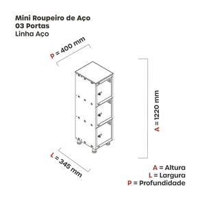 Armário Roupeiro de Aço totalmente montável, dispensa a utilização de parafusos, estrutura em chapas #24 e #26 (0,60mm e 0,45mm) conta com uma porta com estampos circulares em formação triangular para ventilação, sistema de fechamento de varão de 3 pontos, através de pitão para cadeado.