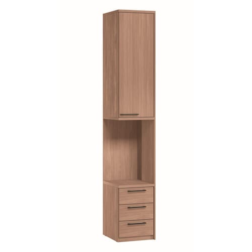 Estrutura Composto por 1 porta com 2 prateleiras internas e 3 gavetas com corrediças telescópicas, o módulo oferece excelente espaço para organizar toalhas, roupas de cama e objetos pessoais. O modelo ainda conta com puxadores em alumínio, dobradiças com amortecedores e base superior em 25 mm, garantindo resistência e um toque de sofisticação.