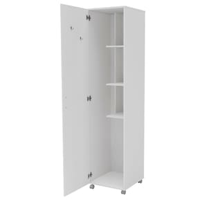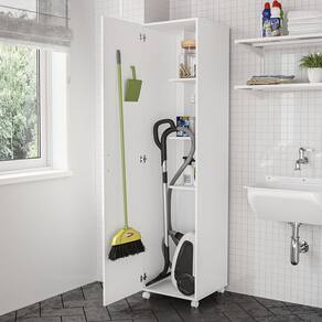 Características: Estrutura MDP Pintura UV Fosca 01 Porta com dobradiças metálicas 03 Prateleiras com espaço para tábua de passar Puxadores em Plástico Peso suportado por Prateleira: 5kg