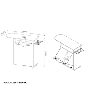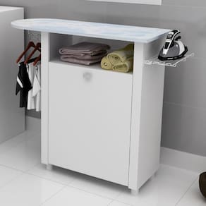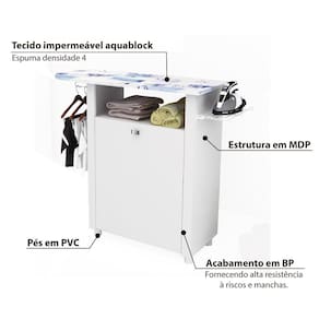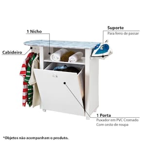 Características - Cor: Branco. - Estrutura em MDP 15mm e fibra 3mm (costa). - Acabamento em BP. - Tábua Passar: Espuma densidade 4 e tecido impermeável aquablock. - 1 Porta com cesto em saco. - 1 Nicho. - Cabideiro. - Suporte para ferro de passar. - Puxador em PVC cromado. - Dobradiça Metálica. - Pés em PVC. - Suporta: Topo: 13 kg / Nicho: 13 kg / Porta roupas: 3 kg - Móvel entregue desmontado.