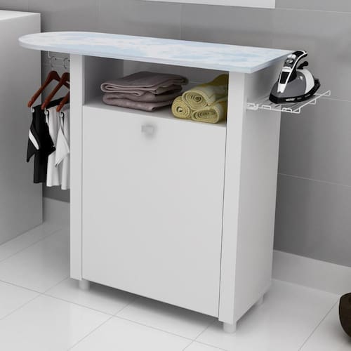 Armário com Tábua de Passar da Tecno Mobili é compacta e ideal para economizar espaço na sua lavanderia ou área de serviço. Cabideiro, suporte para ferro, uma porta com cesto em saco, para colocar roupas e 1 nicho. Produzido em MDP e acabamento em BP, dando maior estabilidade, durabilidade e resistente a riscos, espuma densidade 4 e tecido impermeável aquablock.