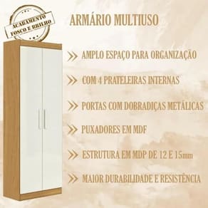 Armário Multiuso 2 Portas 191 Aramóveis Produzido em aglomerado 12mm e 15mm de espessura, proporcionando resistência e durabilidade. Amplo espaço interno, garantindo maior firmeza ao móvel. Puxadores de mdf dando maior resistência. 4 Prateleiras amplas, proporcionando maior conforto e comodidade em guardar seu sapatos sem amassar. Dobradiças metálicas dando maior durabilidade e resistência ao abrir e fechar as portas. Acabamento em verniz texturizado fosco e verniz brilho nas portas, garantindo a conservação do móvel, além de manter a beleza constante oferece ao móvel, resistência e durabilidade prolongando a vida útil do produto. Atenção: A coloração das imagens do produto pode ter diferentes tonalidades dependendo do seu monitor. Ao receber o produto verifique as seguintes informações: Confira a quantidade de caixas e volumes; Consulte se o nome do comprador consta em todas as etiquetas; Verifique se as caixas não apresentam sinais de violação; Sempre confira seu produto no ato da entrega. NÃO nos responsabilizamos pela montagem do produto. Caso resida em apartamento, verificar se todos os volumes possuem tamanhos adequados ao elevador, Caso contrário é necessário solicitar ajuda para entrega de seu produto até seu apartamento. As imagens são ilustrativas e o produto mencionado nessa compra é o produto do título. Marca: Aramóveis Material: MDP Acabamento: Pintura UV Número de Portas: 2 Portas Quantidade de Prateleiras: 4