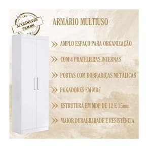 Armário Multiuso 2 Portas 191 Aramóveis Produzido em aglomerado 12mm e 15mm de espessura, proporcionando resistência e durabilidade. Amplo espaço interno, garantindo maior firmeza ao móvel. Puxadores de mdf dando maior resistência. 4 Prateleiras amplas, proporcionando maior conforto e comodidade em guardar seu sapatos sem amassar. Dobradiças metálicas dando maior durabilidade e resistência ao abrir e fechar as portas. Acabamento em verniz texturizado fosco e verniz brilho nas portas, garantindo a conservação do móvel, além de manter a beleza constante oferece ao móvel, resistência e durabilidade prolongando a vida útil do produto. Atenção: A coloração das imagens do produto pode ter diferentes tonalidades dependendo do seu monitor. Ao receber o produto verifique as seguintes informações: Confira a quantidade de caixas e volumes; Consulte se o nome do comprador consta em todas as etiquetas; Verifique se as caixas não apresentam sinais de violação; Sempre confira seu produto no ato da entrega. NÃO nos responsabilizamos pela montagem do produto. Caso resida em apartamento, verificar se todos os volumes possuem tamanhos adequados ao elevador, Caso contrário é necessário solicitar ajuda para entrega de seu produto até seu apartamento. As imagens são ilustrativas e o produto mencionado nessa compra é o produto do título. Marca: Aramóveis Material: MDP Acabamento: Pintura UV Número de Portas: 2 Portas Quantidade de Prateleiras: 4