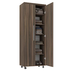 * Imagens meramente ilustrativas. Armário multiuso e multi-ambiente, possui 2 portas e 5 prateleiras internas, sendo 4 delas móveis e apenas a do meio fixa. Muito comumente é utilizado como sapateira, guarda-roupa infantil, para guardar mantimentos, produtos de limpeza ou no escritório. - 6 Espaços dividido por prateleiras para organizar melhor os objetos; - Chapa de MDP 15mm de espessura; - Acabamento Fosco Texturizado; - Dobradiças Metálicas; - Rodízios com chapa de ferro; - Puxadores cromados. Dimensões do produto montado: altura 182 cm largura 67 cm profundidade 39 cm Manual de montagem disponível no site do fabricante. Perguntas frequentes: 1) Qual a capacidade suportada? RESP 1) Suporta até 25kg por prateleira e até 200kg total no produto. 2) As prateleiras são reguláveis? RESP 2) Não, as prateleiras não são reguláveis. A prateleira central é fixa inclusive. As demais poodem ser removidas se necessário. 3) O produto vem montado ou desmontado? RESP 3) O móvel é entregue desmontado, com kit de ferragens e manual de montagem. O serviço de montagem de móveis pode ser oferecido adicionalmente ao simular o para sua (se disaponível a vai informar). 4) É em MDF? RESP 4) Não. O produto é em MDP 15mm revestido com BP. 5) Posso mudar as medidas? RESP 5) Não pode. Atenção: Não nos responsabilizamos, no ato da , por desmontagens, subir escadas/elevadores ou por guincho para apartamentos. Eventuais despesas são de responsabilidade do cliente. Confira as dimensões deste produto e certifique-se de que o mesmo passará normalmente por supostos elevadores, portas, escadas e/ou corredores de sua moradia.