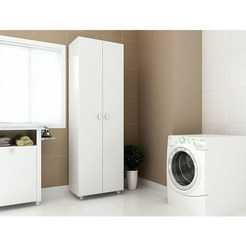 Procurando Armário de serviço mais moderno e sofisticado. O Armário de serviço AM3101 é produzido em MDP de 15 mm, matéria prima que respeita o meio ambiente. Possuir 2 portas onde são utilizadas dobradiças metálicas para garantir a suavidade e segurança no abrir e fechar. Com 5 nichos internas com o espaço interno bem aproveitado. Ganchos metálicos para pendurar rodos, pás, vassouras e etc. Possuir 4 rodízios em plástico resistente -polipropileno- permitem movimentar o móvel com facilidade. Puxadores em plástico resistente -poliestireno-. Acabamento das portas em pintura fosca com secagem UV. Tenha em casa um produto prático e funcional, seu ambiente ficará mais bonito e mais moderno. Aproveite!