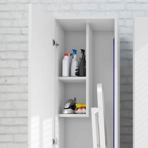 Detalhes do produto: - É de responsabilidade do montador seguir as instruções do Manual de Montagem, que são fundamentais para garantir a estrutura do móvel; - Produto enviado desmontado, a montagem é simples e pode ser realizada facilmente com a ajuda do manual de montagem; - Possui 1 porta com dobradiça metálica e puxador ponto em plástico, dois nichos que suportam 3 e 5kgs; - A fixação das peças e/ou acessórios é feita por parafusos, cavilhas; - Espaço para guardar vassoura, aspirador de pó e/ou baldes; - O móvel acompanha gancho; - Possui 4 pés plásticos; - Produto suporta até 30kgs.