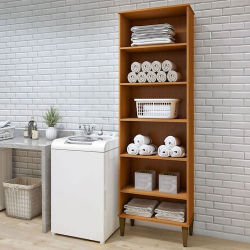 O(a) Armário Multiuso Aracaju 5 Prateleiras Natural - Kaiki Móveis  é produzido em MDP na escala de brilho Fosco, e possui um grau de dificuldade de montagem: Médio.