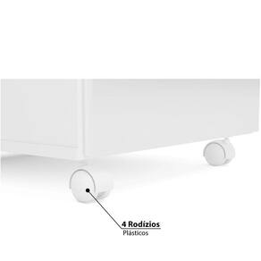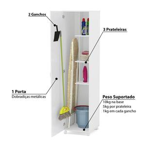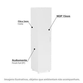 Características - Cor Branco. -Acabamento: MDP 15mm / Fibra 3mm (costa). -Acabamento: Finish Foil (FF) - 1 Porta - 3 Prateleiras - 4 Rodízios plásticos - 1 Puxador plástico - Peso Suportado: Até 10kg na base inferior, até 5kg nas prateleiras e 1 kg em cada gancho - Montagem Reversível. - Limpeza somente com pano umedecido. Finalizar a limpeza com um pano seco. - Móvel desmontado. - Manual de montagem.