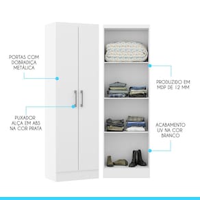 O Armário Multiuso foi desenvolvido pensando em atender todas as suas necessidades do dia a dia com um design atual, unindo versatilidade, conforto e beleza. Pode ser utilizado como sapateiro no quarto, armário multiuso na área de serviço, armário extra na cozinha, guarda objetos da garagem ou onde você precisar. Possui duas porta e prateleiras internas perfeitas para manter tudo organizado. Produzido com materiais de excelente qualidade, garantindo a sua durabilidade. O melhor em móveis no design atual aliando conforto, qualidade e ótimos preços, só na Menu Móveis! CARACTERÍSTICAS TÉCNICAS: - Produzido em MDP de 12 mm - Acabamento UV na cor Branco - Portas com Dobradiça Metálica - Puxadores Alça em ABS na cor Prata INFORMAÇÕES TÉCNICAS: Altura: 170 cm Largura: 52 cm Profundidade: 31,5 cm Peso: 22 kg INFORMAÇÕES ADICIONAIS: - ATENÇÃO: Não trabalhamos e não nos responsabilizamos pela montagem do móvel. Antes da montagem conferir se o produto está de acordo com o que comprou, produto montado e danificado pela montagem não será aceito troca. - As imagens ambientadas são meramente ilustrativas e podem apresentar itens que não compõe o produto. As cores do produto podem variar de acordo com o monitor, a iluminação do ambiente ou sua percepção visual. - Limpeza: Deve ser feita com pano macio e seco ou levemente umedecido com água e sabão neutro. Não devem ser utilizados abrasivos como palha de aço e objetos cortantes. Garantia para defeitos de fabricação conforme Código de Defesa do Consumidor. Ean: 7805295041225 Ean: 7805295041225