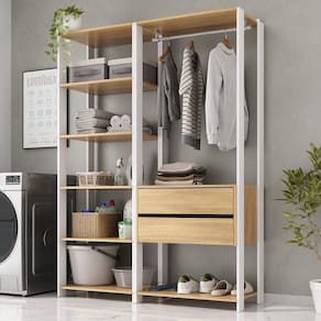 O armário é equipado com 7 prateleiras espaçosas (suportam até 8kg em cada), ideais para manter produtos de limpeza e utensílios de lavanderia organizados de forma inteligente, ajudando você a criar um ambiente mais eficiente e funcional para as tarefas domésticas. O cabideiro de madeira revestido garante que suas roupas, sejam longas ou curtas, fiquem sempre impecáveis. Além disso, com 2 gavetas que possuem corrediças metálicas, o manuseio ganha leveza e praticidade. O design aberto e moderno que realça qualquer espaço.