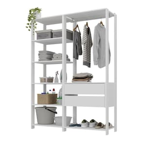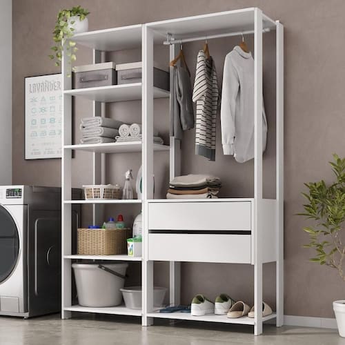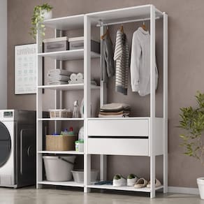 O armário é equipado com 7 prateleiras espaçosas (suportam até 8kg em cada), ideais para manter produtos de limpeza e utensílios de lavanderia organizados de forma inteligente, ajudando você a criar um ambiente mais eficiente e funcional para as tarefas domésticas. O cabideiro de madeira revestido garante que suas roupas, sejam longas ou curtas, fiquem sempre impecáveis. Além disso, com 2 gavetas que possuem corrediças metálicas, o manuseio ganha leveza e praticidade. O design aberto e moderno que realça qualquer espaço.