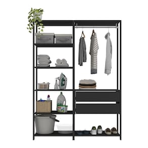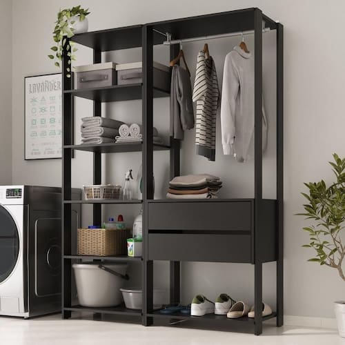 O armário é equipado com 7 prateleiras espaçosas (suportam até 8kg em cada), ideais para manter produtos de limpeza e utensílios de lavanderia organizados de forma inteligente, ajudando você a criar um ambiente mais eficiente e funcional para as tarefas domésticas. O cabideiro de madeira revestido garante que suas roupas, sejam longas ou curtas, fiquem sempre impecáveis. Além disso, com 2 gavetas que possuem corrediças metálicas, o manuseio ganha leveza e praticidade. O design aberto e moderno que realça qualquer espaço.
