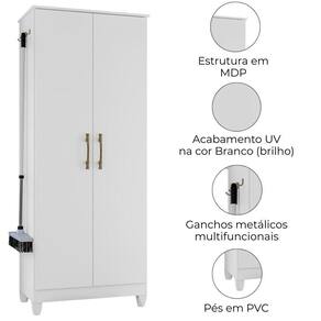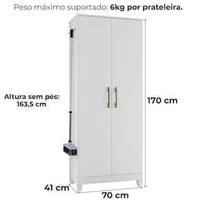Armário Multiuso Jade, desenvolvido para otimizar ambientes compactos com praticidade. Estrutura em MDP (15 / 12 mm) com acabamento em pintura UV. Internamente, dispõe de prateleiras bem distribuídas e ganchos metálicos (internos e externos) funcionais que ampliam as possibilidades de uso. Equipado com 2 portas com dobradiças metálicas e dupla opção de montagem: pés em PVC ou sapatas niveladoras. Este produto será entregue em 01 volume.
