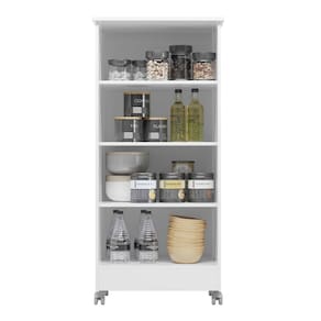 Características Estrutura em MDP de 12mm. Pintura em acabamento UV. 01 Porta articulada com dobradiças metálicas. Puxador na cor bronze. 04 Rodízios. Amplo espaço composto por prateleiras com opções de regulagem na altura.