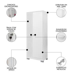 Com um design moderno e um compartimento interno amplo, versátil e funcional, esse armário para lavanderia conta com diversas prateleiras para organizar todo tipo de produtos. Mas, não para por aí, se você não gosta de deixar rodos e vassouras à amostra, basta optar por remover algumas prateleiras, adicionar os ganchos organizadores e pronto, terá um lugar só para isso. Para completar, além da funcionalidade, o design moderno com a porta ripada e chave garantem charme e segurança. Afinal, todos os espaços da casa merecem um toque de beleza e cuidado.