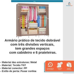 O armário dobrável é ideal para quem precisa de funcionalidade, unindo o útil e prático é a melhor opção para manter seus pertences organizados. Projetado em tecido de alta qualidade garante facilidade na hora de limpar. Possui três divisões verticais em grandes espaços com cabideiro, 6 prateleiras e cortina de puxar com fechamento de zíper, suportando até 50kg. Sua montagem é simples e pode ser usada em qualquer ambiente.